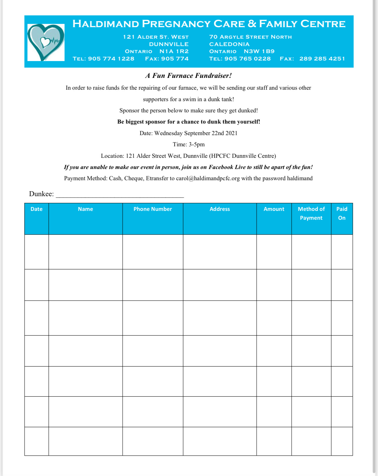 The Haldimand Pregnancy Care & Family Centre is raising funds for a furnace and Rhonda Devay is one of the staff getting “dunked” for the cause. We need to raise enough to get her in there… print the pledge sheet below if you’d like to be involved.